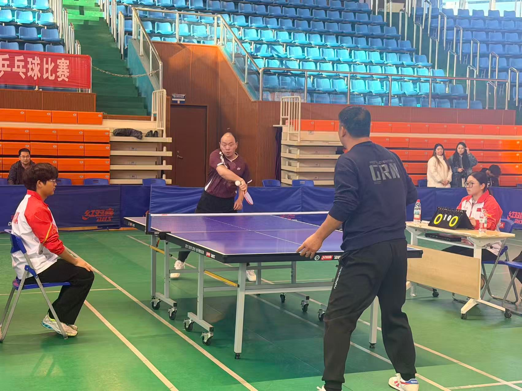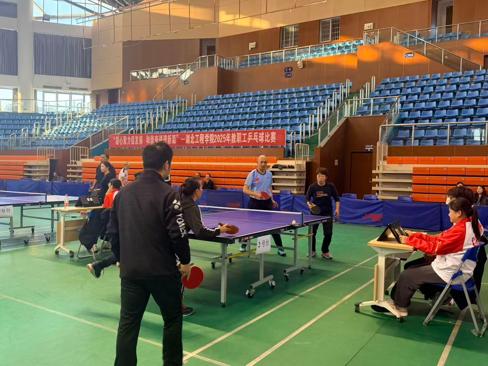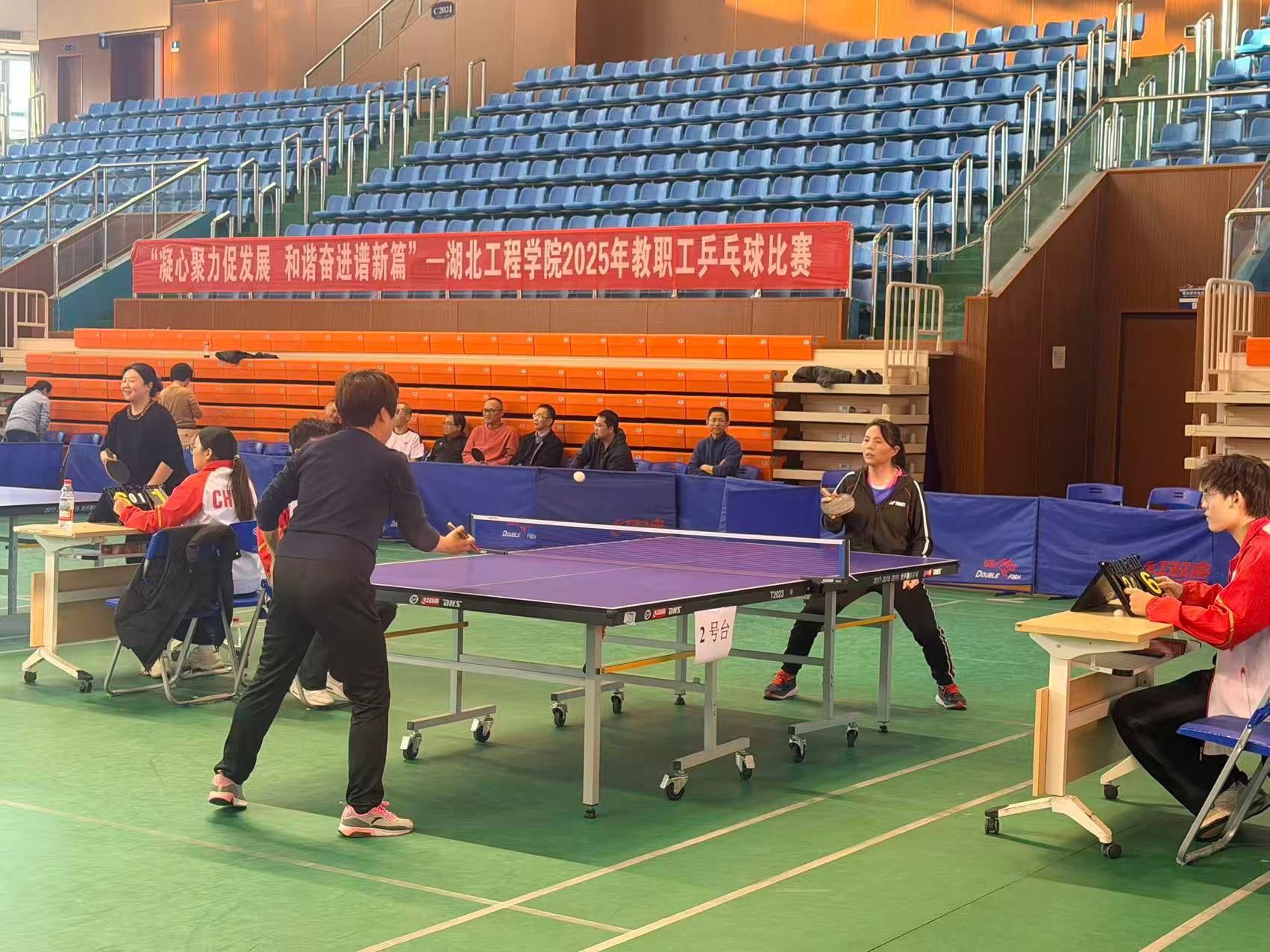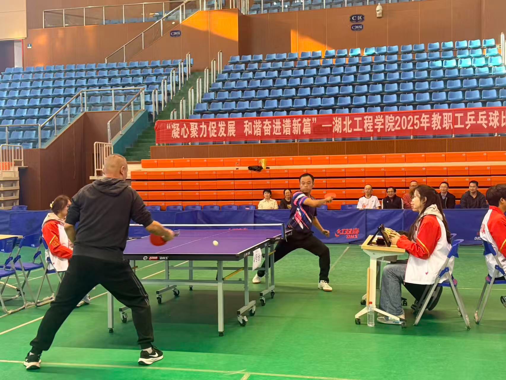 本次比赛采用男女混合团体比赛方式,按照男单、女单、混双、男二单、男三单的出场顺序依次上场。比赛采取五场三胜制,每场采取三局两胜制。赛场上,运动员们尽显风采:单打对决中,选手们精准推挡、凌厉扣杀,每一分争夺都扣人心弦;混双配合时,搭档间眼神交汇、步伐协同,用默契诠释团队力量,充分展现出教职工们昂扬向上的精神风貌。