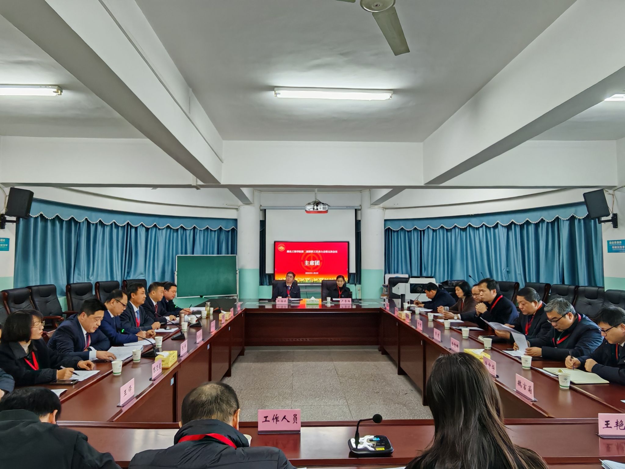 1月9日,湖北工程学院第二届教职工代表大会第五次会议在文学楼报告厅胜利召开。校领导卢雪梅、汪海波、陈伟、邹虹、李渺、郑俊、熊曾刚出席会议。大会主席团成员在主席台就座。上午的开幕会由学校党委副书记、工会主席陈伟主持,党委副书记、校长汪海波主持了下午的闭幕会。