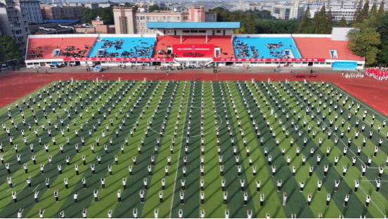开幕式前,近千名教职工与学生共同表演了中华传统养生功法八段锦。他们动作舒展流畅、整齐划一,迅速点燃了现场气氛。教职工代表队身着统一服装,迈着矫健的步伐通过主席台,齐声高呼“湖工教工、气势如虹;同心筑梦、勇攀高峰”的嘹亮口号,赢得了全场阵阵热烈掌声。